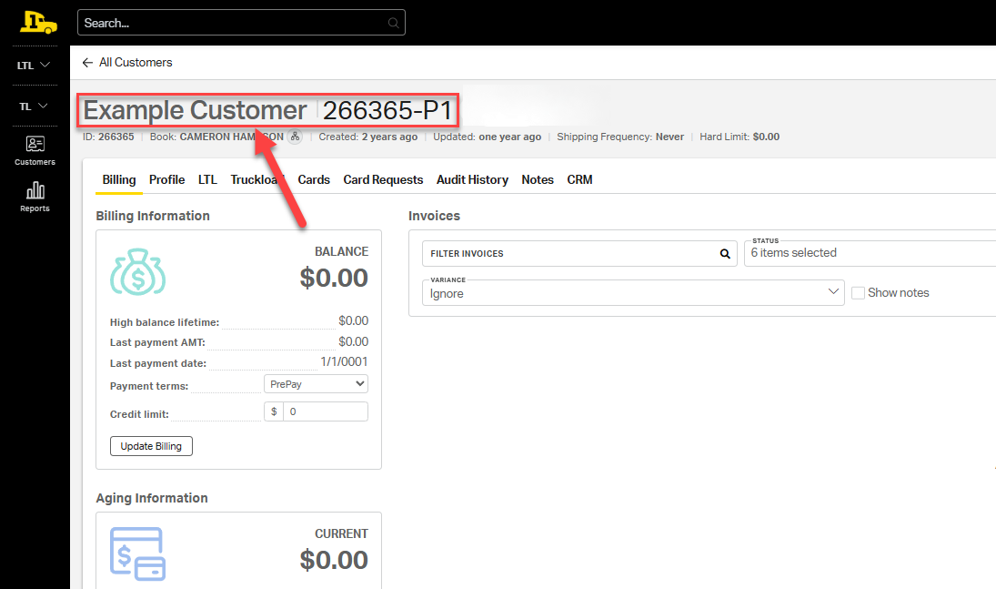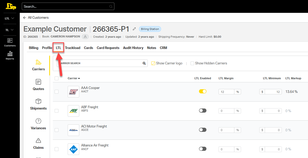 2. Open the LTL tab to view all LTL-related settings for the customer.