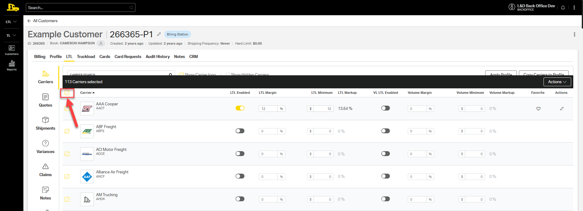 - Active All: Activates both LTL and volume LTL for the carriers selected, meaning the customer can run quotes with those carrier rates.