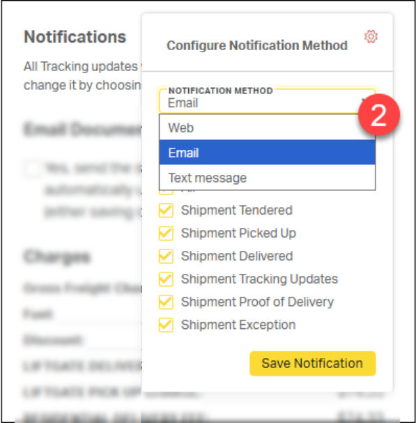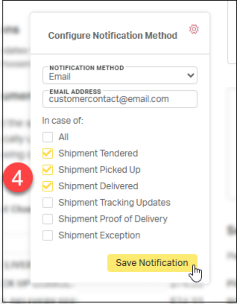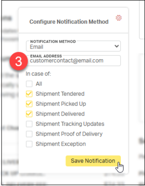 Notifications can be configured to send real-time tracking updates to specific contacts designated by the customer, ensuring the right people stay informed throughout the shipment lifecycle.