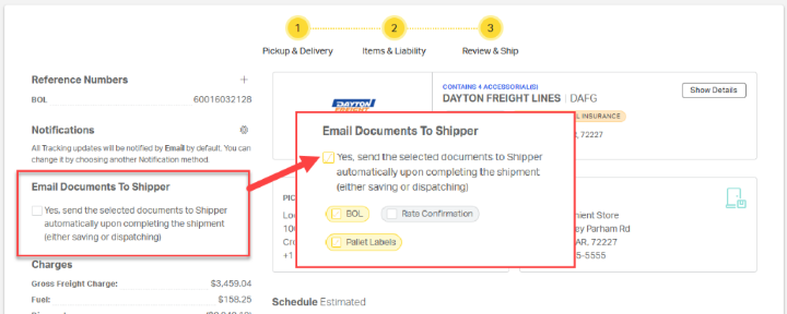 Cabo will automatically send useful documents, including the BOL, rate confirmation, or pallet labels, directly to the shipper. To enable this feature, check the box labeled Email Documents to Shipper; then select the appropriate options.