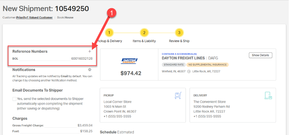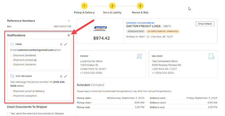 - Review & Ship – Add reference numbers and set up tracking notifications; then review all the shipment details before tendering the shipment (i.e., sending the booking details to the carrier).