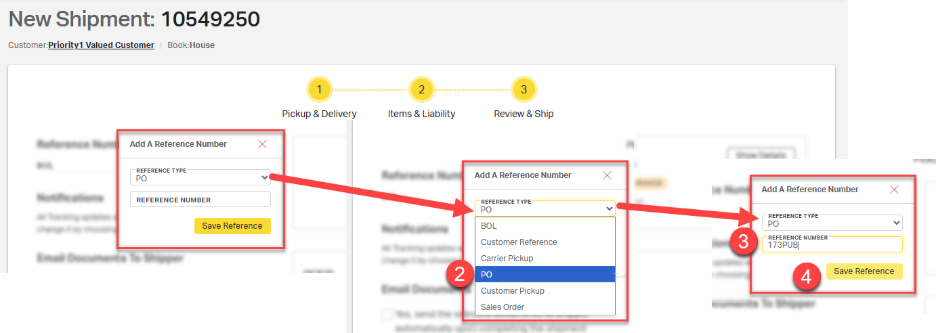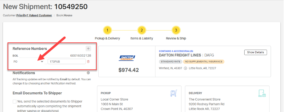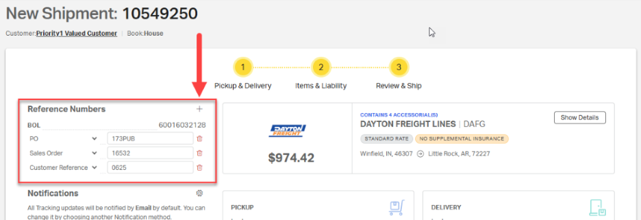 A BOL number is automatically generated and included on the Review & Ship page. To add additional reference numbers, such as a purchase order (PO) or sales order (SO), follow these steps:
