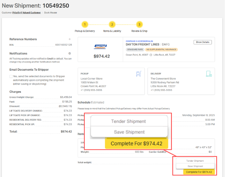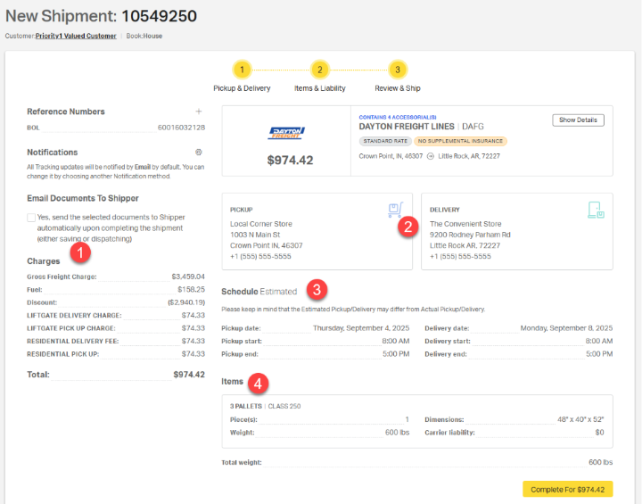 - Pickup & Delivery – Enter addresses, shipping and receiving hours, and contact information for both the shipper and receiver.