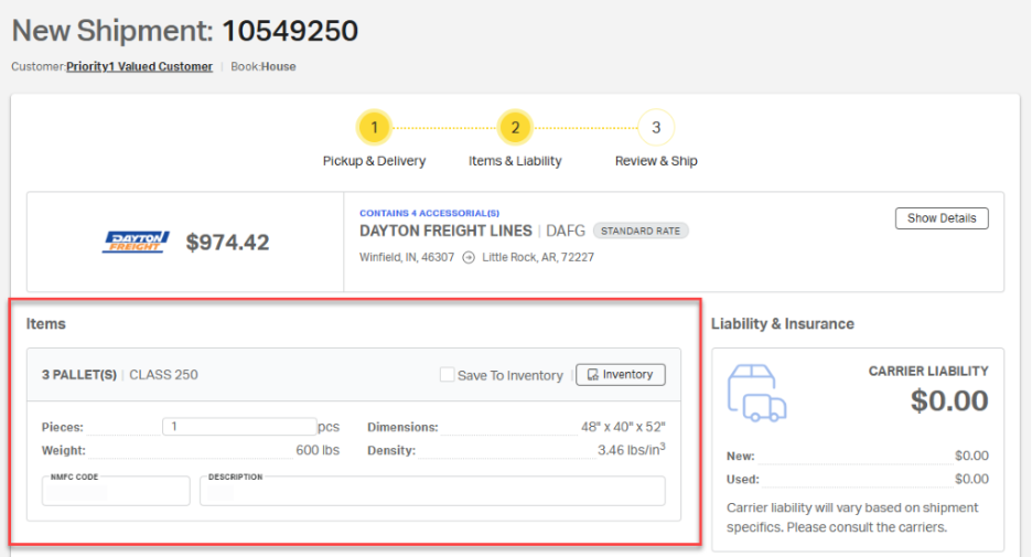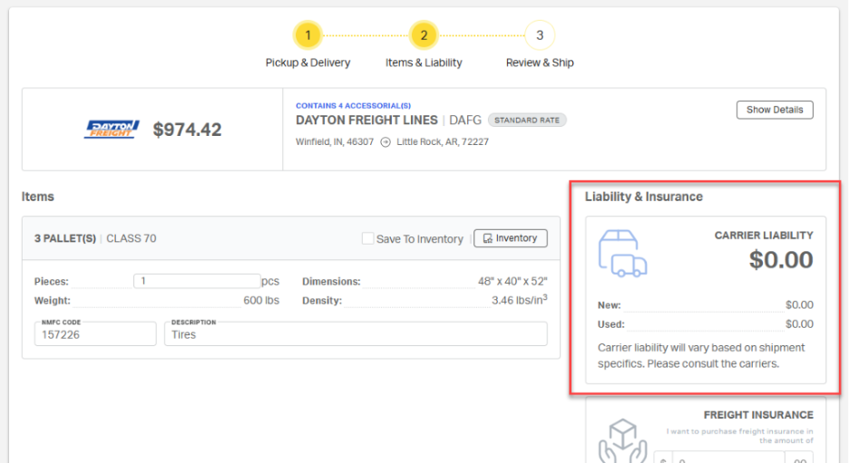 - Items & Liability – Review and confirm the commodity details for the shipment, and add any missing information not included in the original quote. The Items & Liability page also includes the carrier’s liability for the load with an option to purchase third-party freight insurance, if needed.
