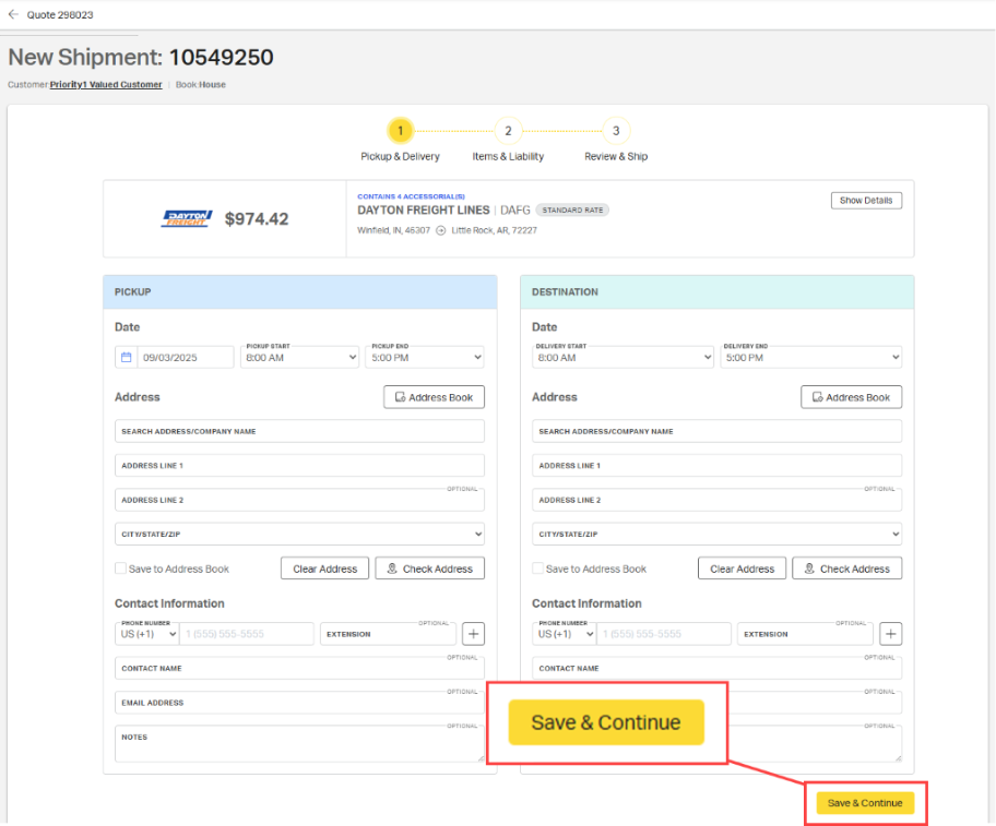 ℹ️ If the Address Book was used to populate the quote form, the corresponding information will also populate on the Pickup and Delivery page.