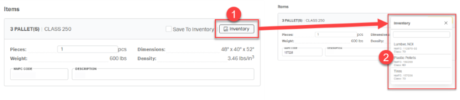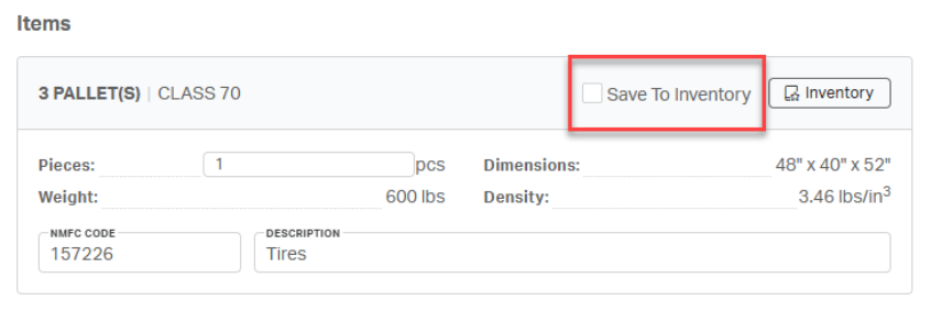 On the Items form, pallet count, class, weight, and dimensions are pre-filled from the initial quote and cannot be modified.