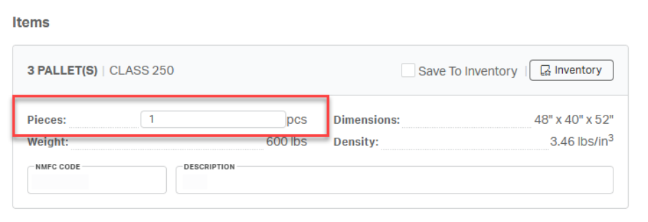 If the NMFC code and item description were included in the quote, they will appear in the Items form and can be edited. If not, enter the appropriate NMFC code, including the subclass for density-based commodities, and description manually.