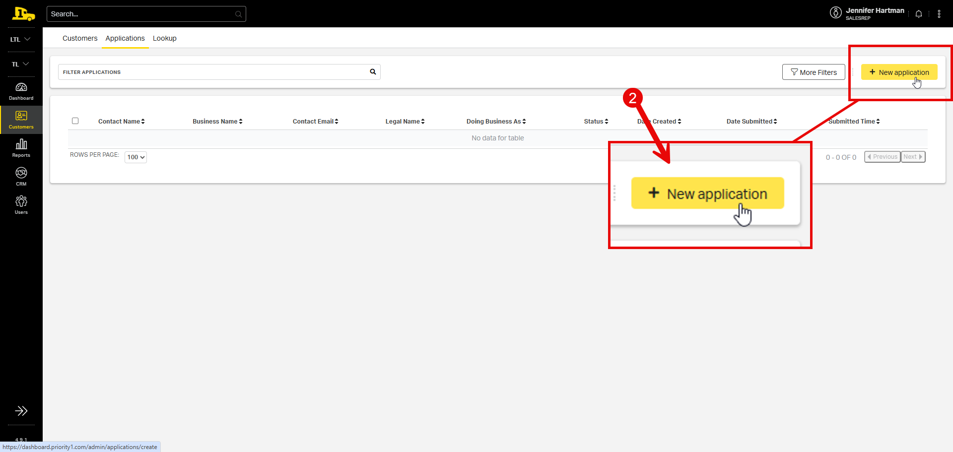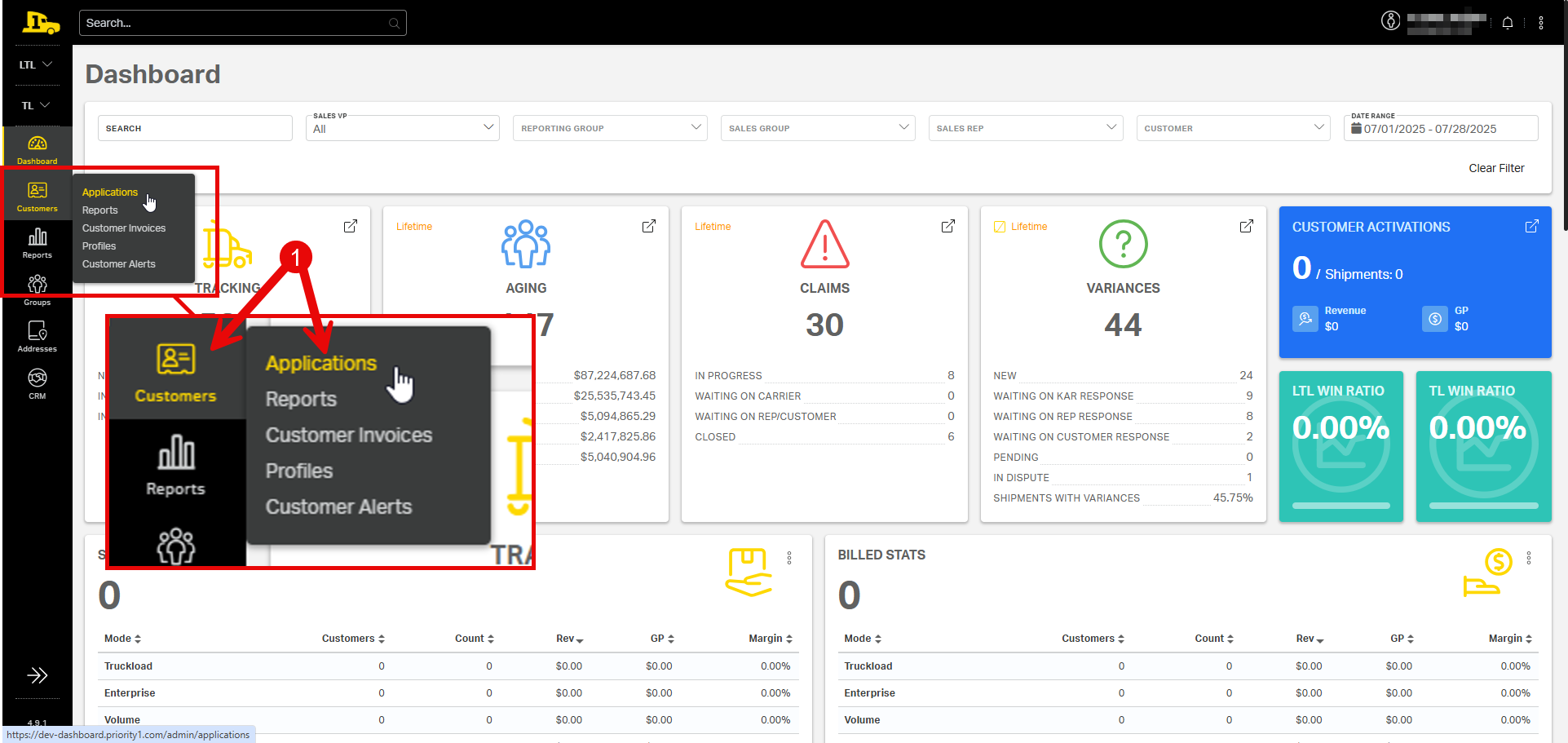 1. Hover over the Customers tab to reveal submenu options. Then select Applications.