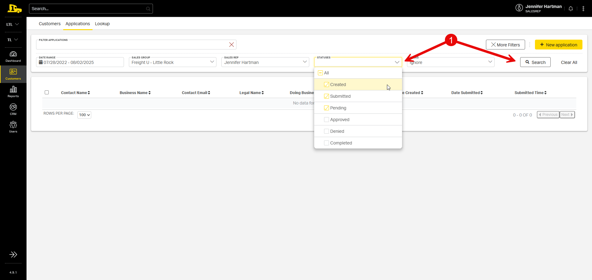 1. From the Applications tab, filter applications by status; then select Search.