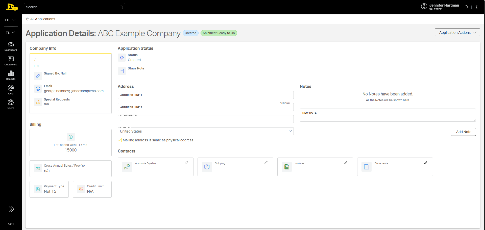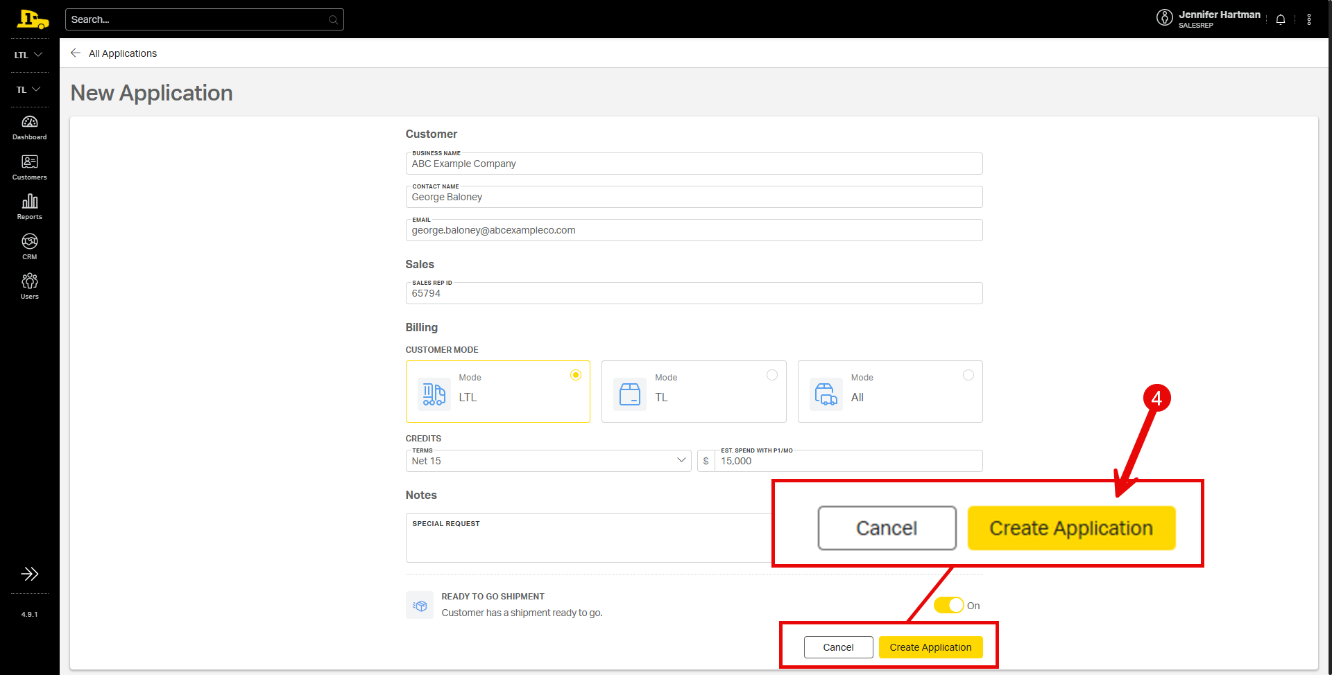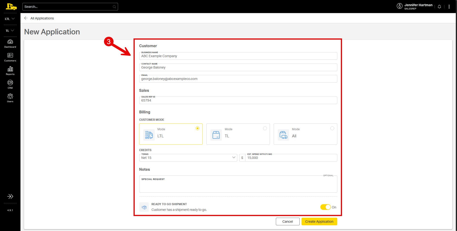 3. Enter the customer’s information, including contact information, modes, credit terms, and any special requests. If the customer has a load pending, turn on the Ready to Go Shipment toggle.