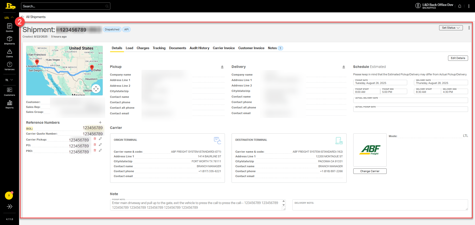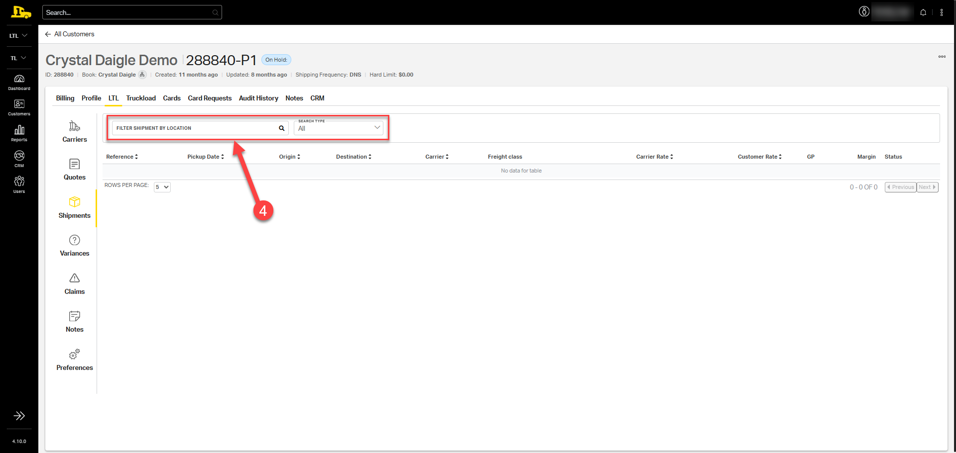 4. Under the Shipments section, all recent LTL shipments will populate. Search by location at the top to narrow down results.