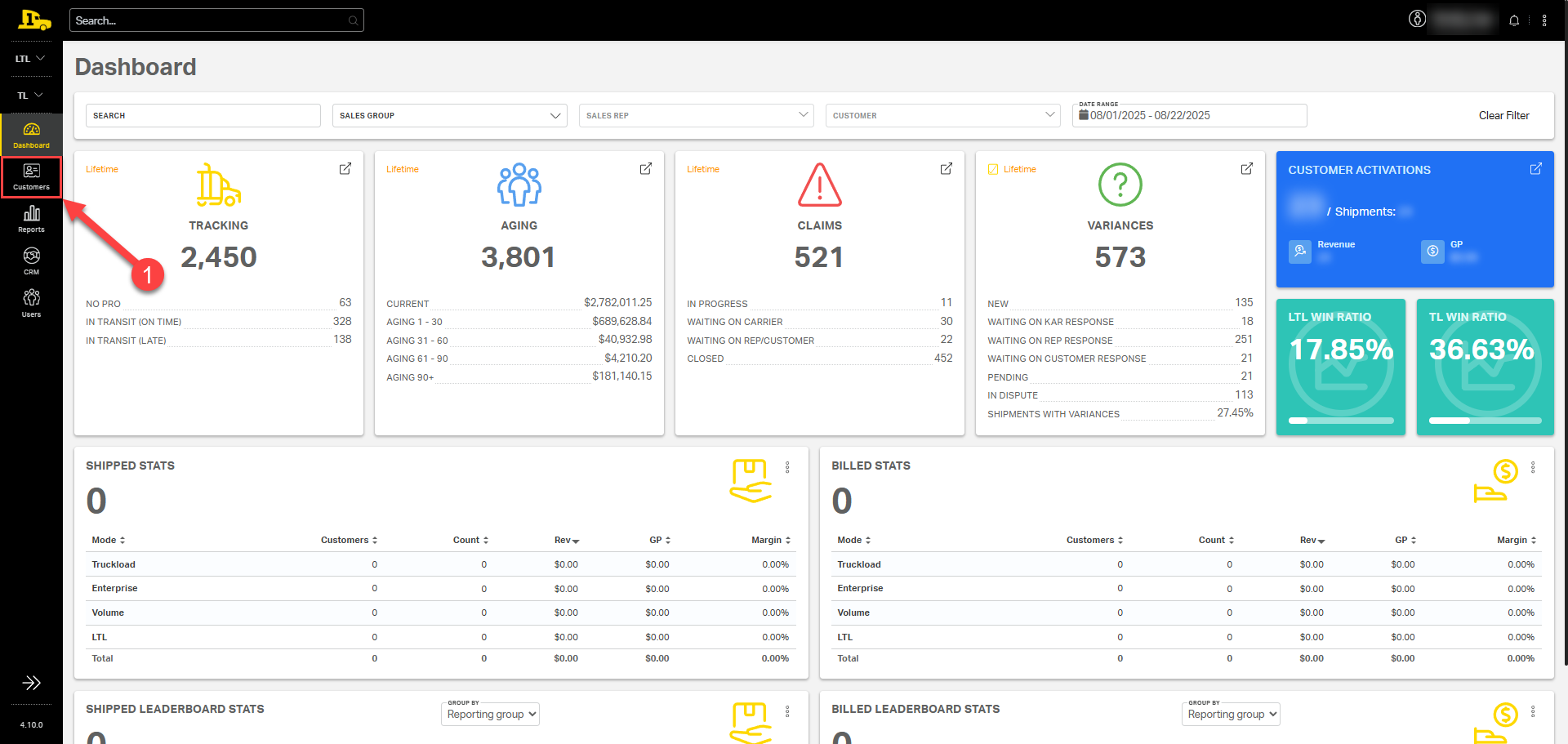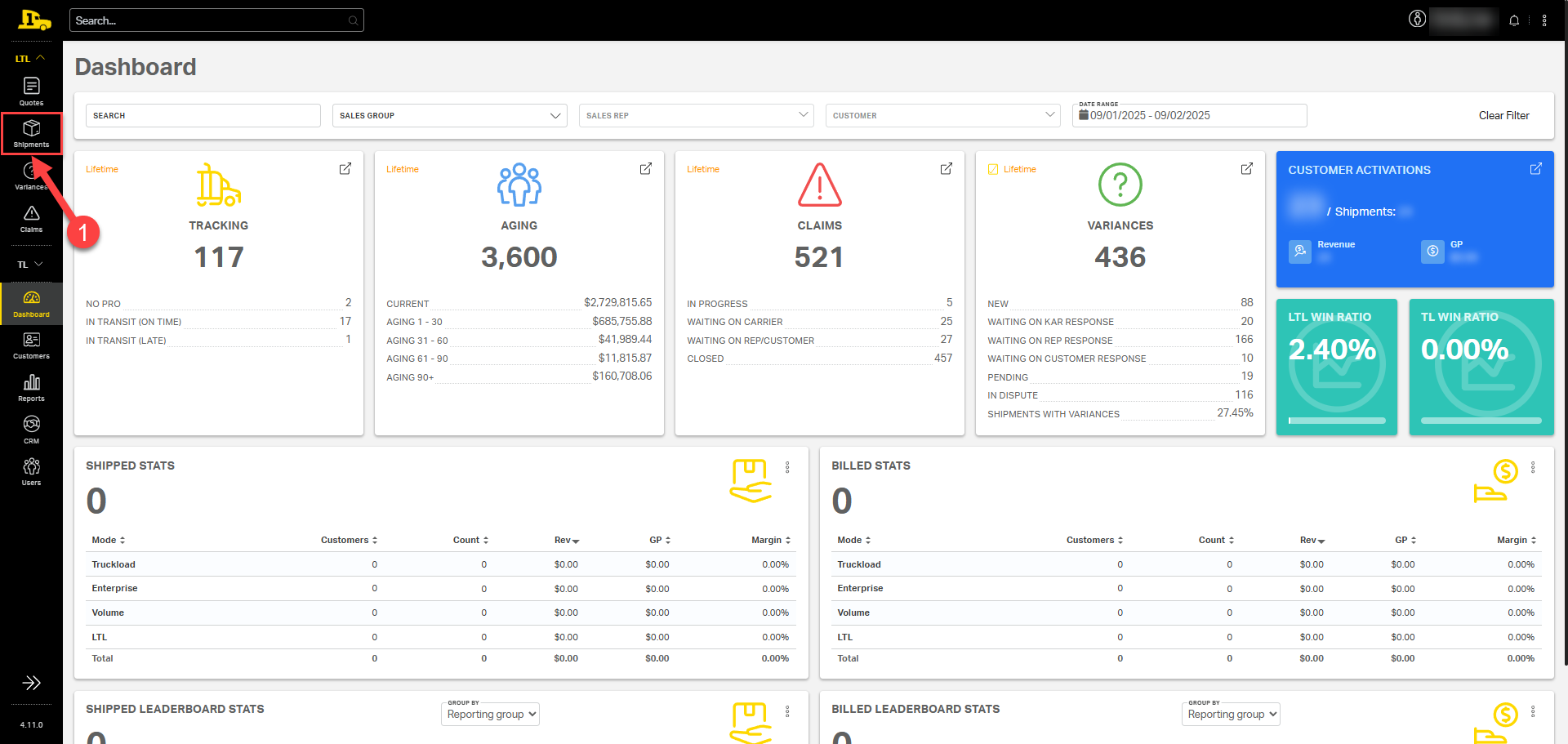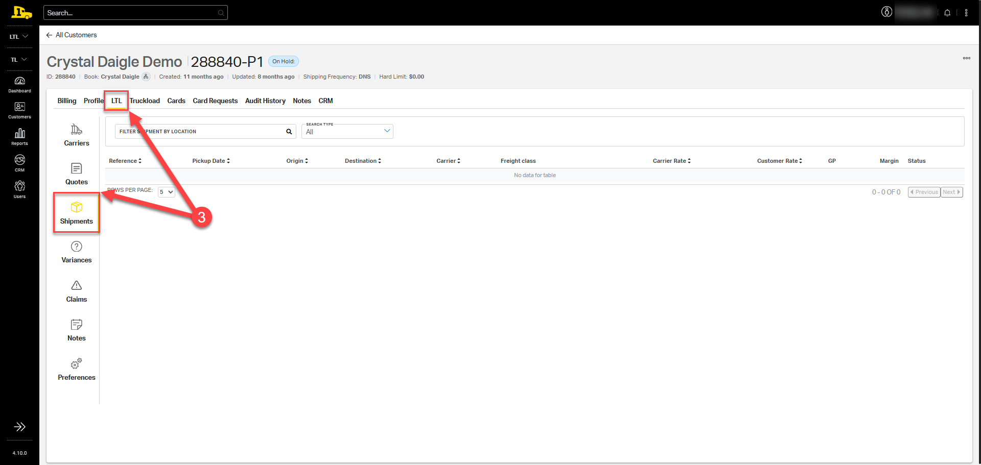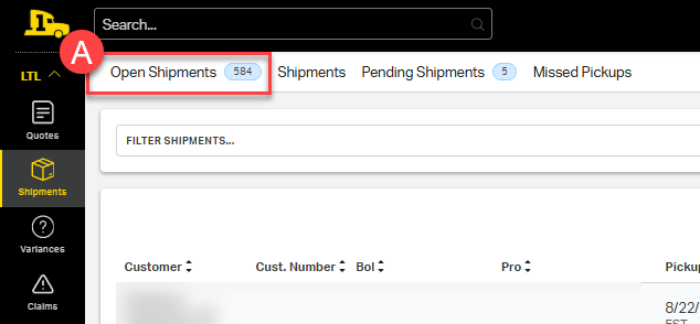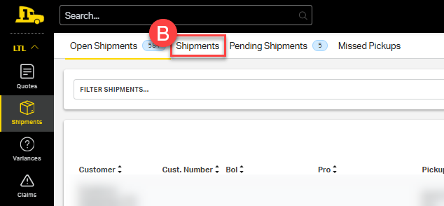 1. From the main dashboard, under LTL, select Shipments on the left-hand side menu.