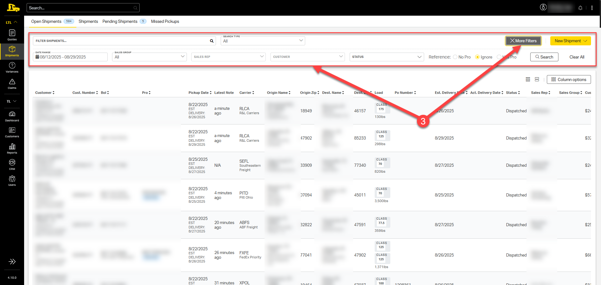 3. Select More Filters at the top to filter by date range, status, whether or not the shipment has a PRO number, and more.