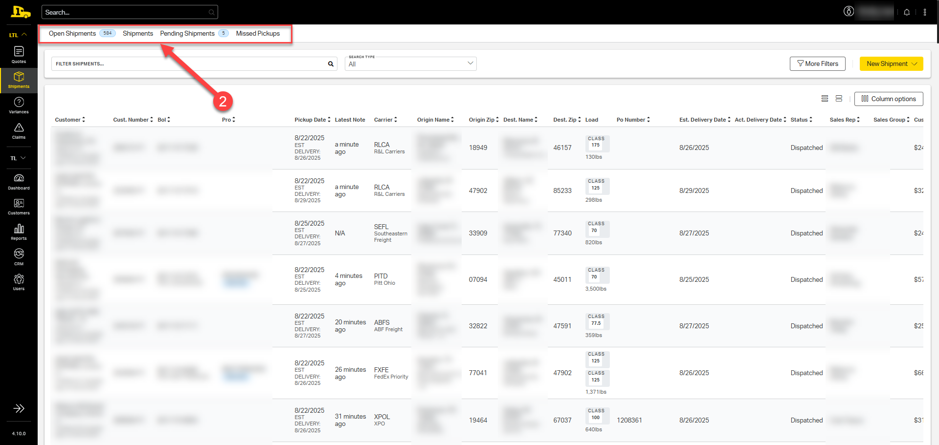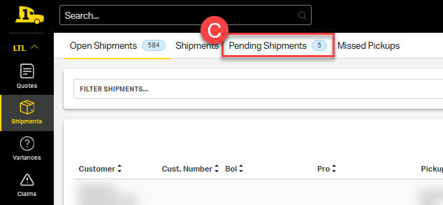2. Select the appropriate tab at the top of the shipments page: