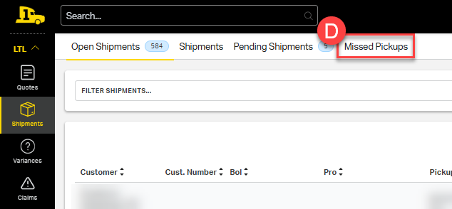 D) The Missed Pickups tab will display shipments with past pickup dates that don't have a PRO number (carrier tracking number). Use the filter at the top select your date range.