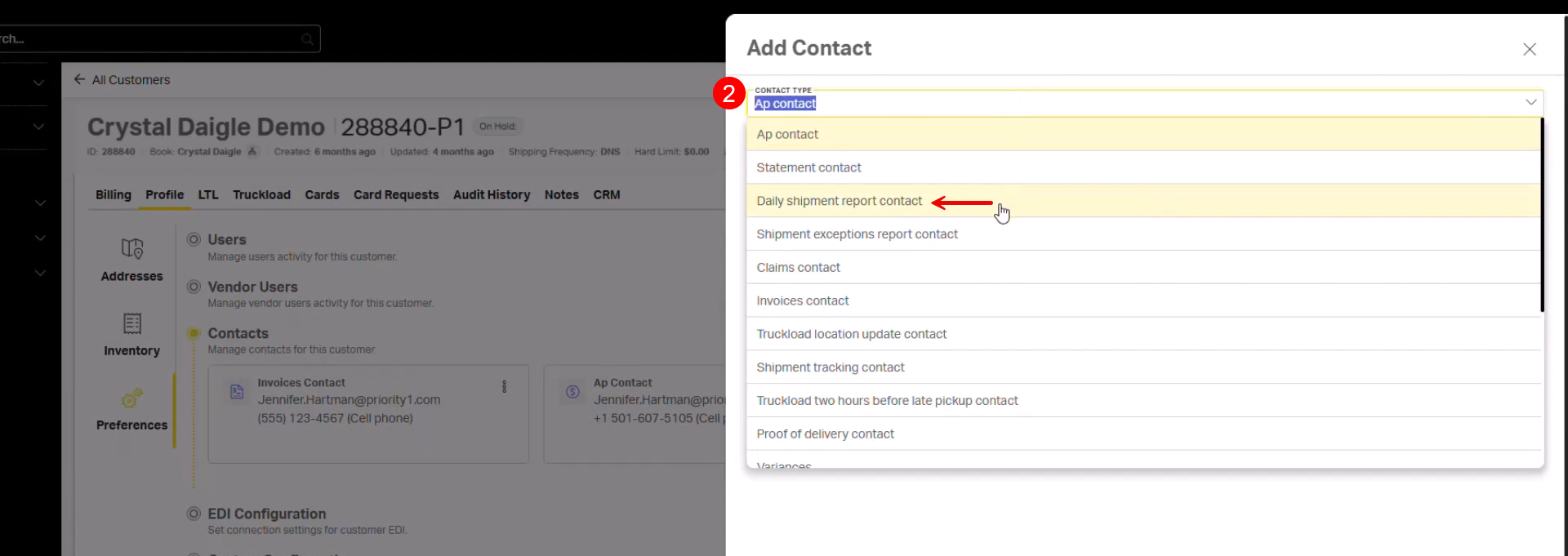 - Open the Contact Type dropdown and select Daily Shipment Report Contact.