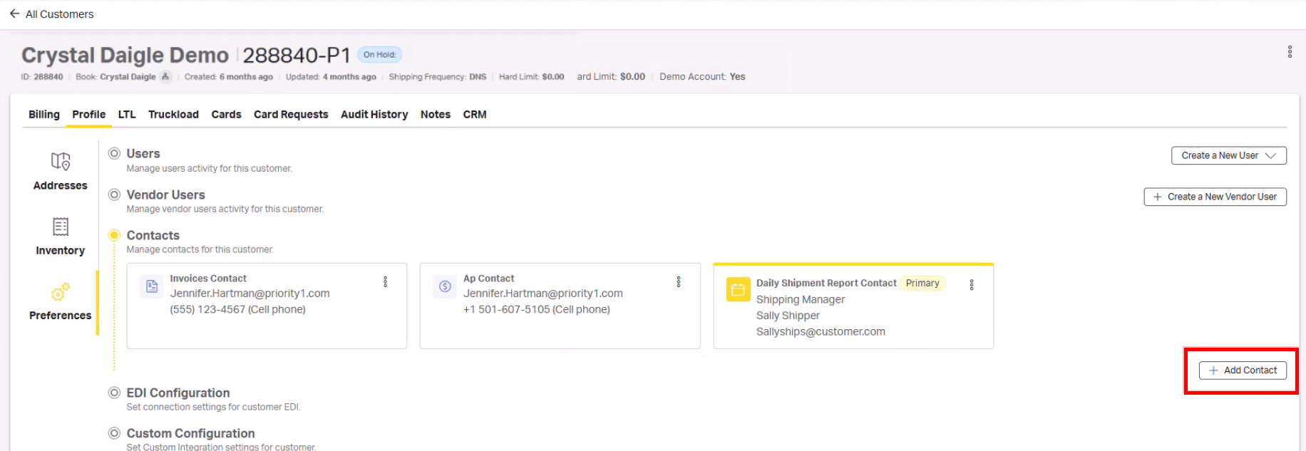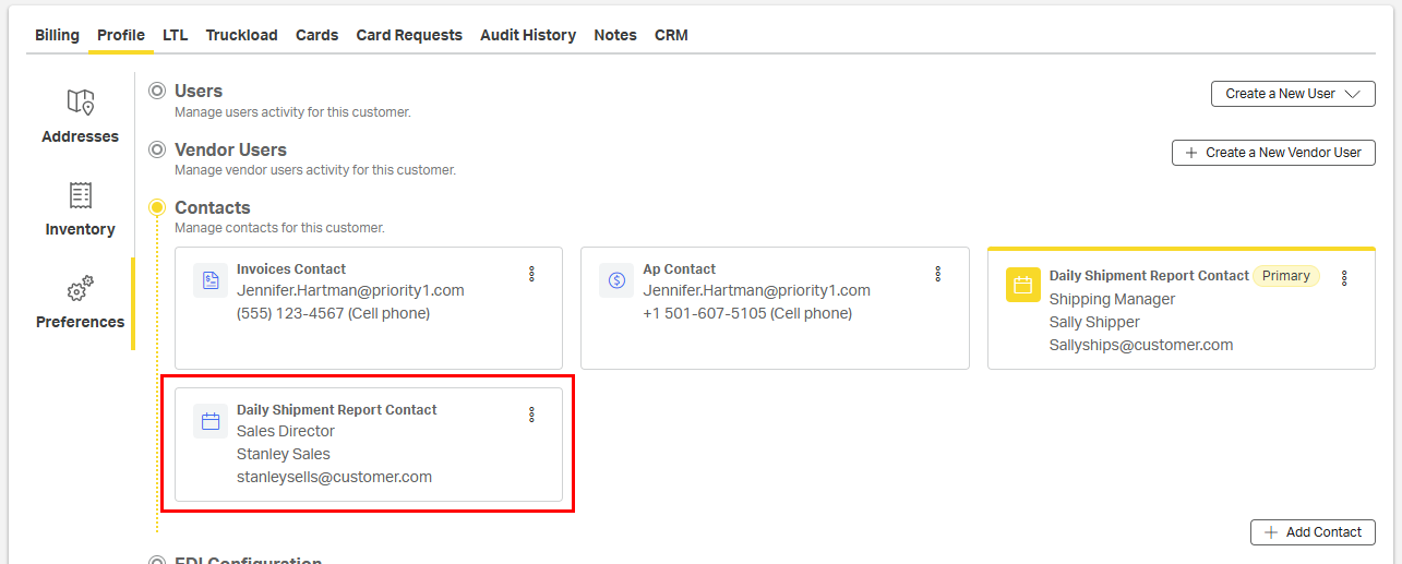 If a recipient for the daily shipment report is already set, there will be a Daily Shipment Report Contact listed under contacts.