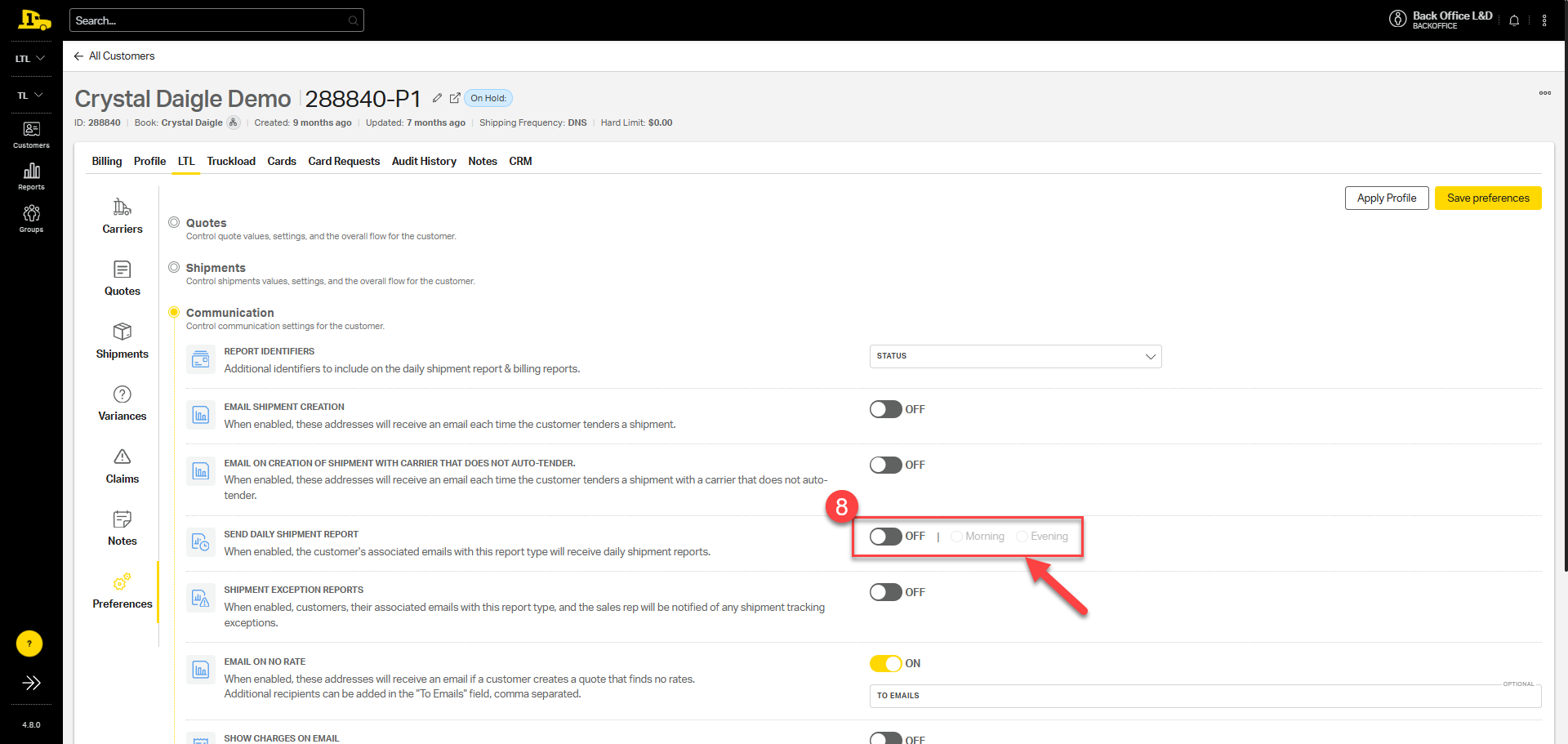 8. Toggle on Send Daily Shipment Report if you want customer to receive email report of daily shipments, then select time of day you want the customer to receive it.