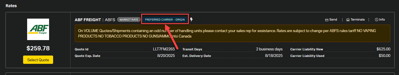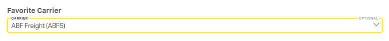 3. Favorite Carrier: Selecting a favorite carrier ensures their rate appears at the top of the quoted rates page for quotes using this address, along with a PREFERRED CARRIER tag next to the favorited carrier's name.