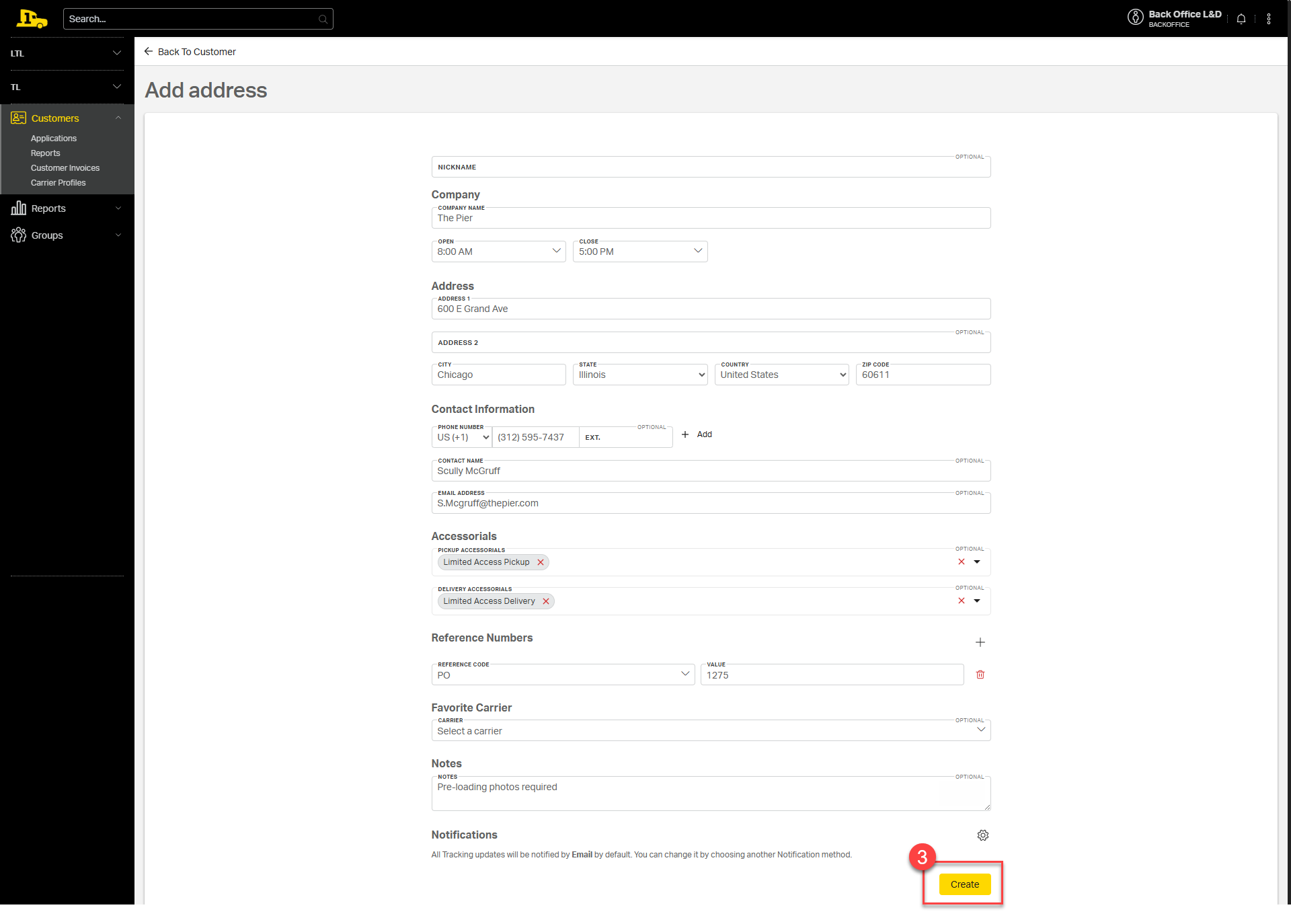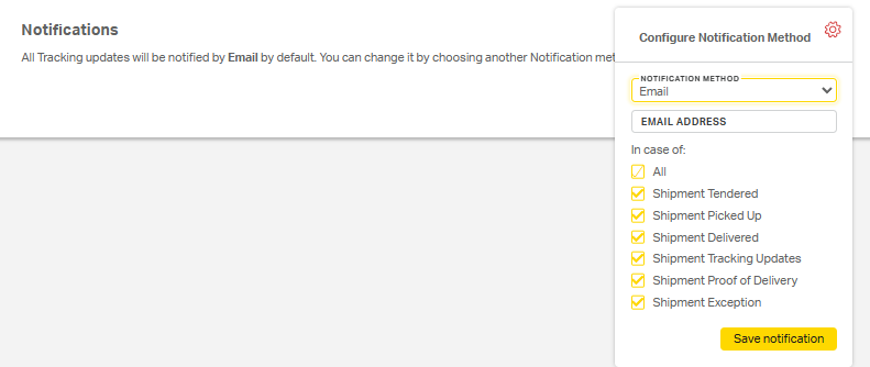 5. Notifications: Set up specific contacts to get notified for any updates on shipments going to/from this address. Select the gear wheel icon, specify contact method (email, text, or web), type in contact information, then select which notifications they should receive (shipment tendered, tracking updates, etc.) and then Save notification.