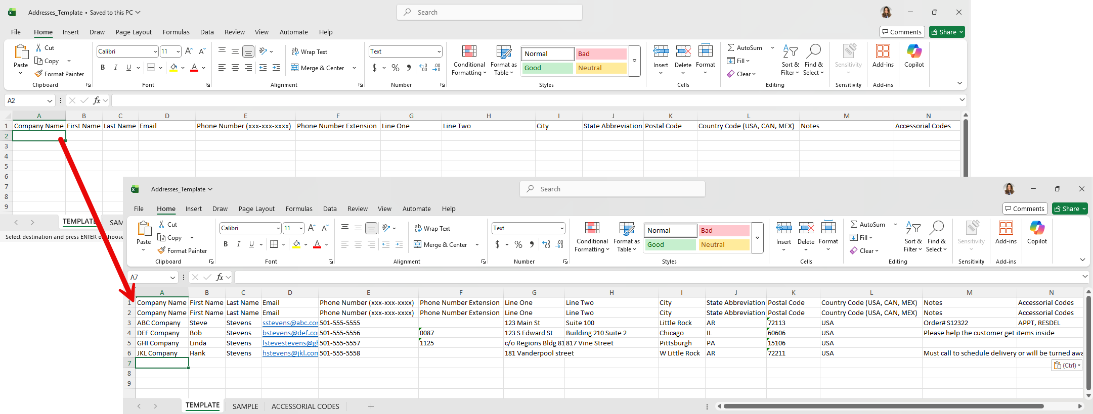 3. Open the resulting Excel file and fill in the details for each address, including any needed accessorials.