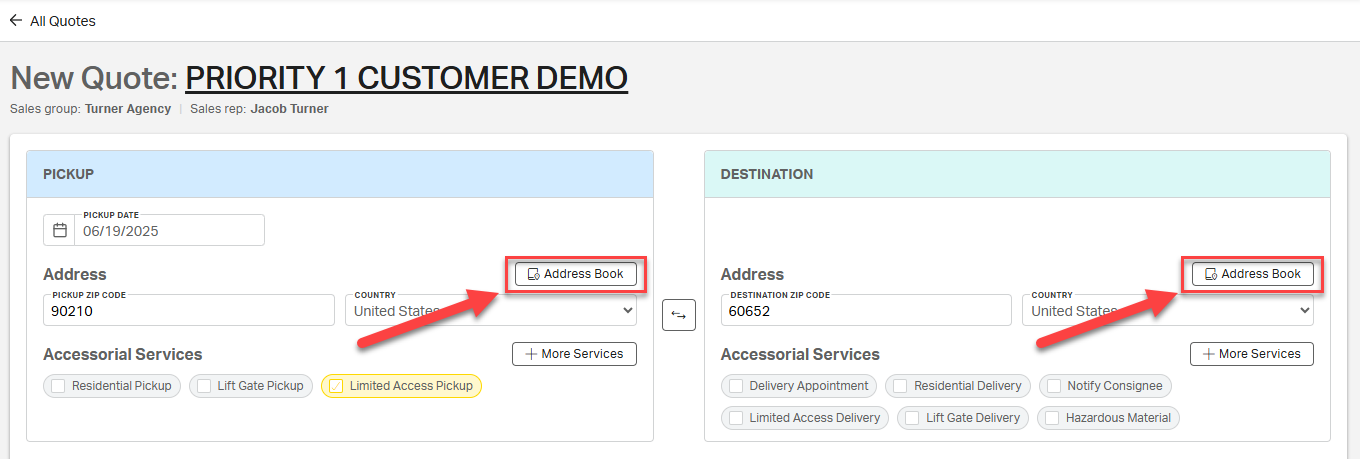 On the New Quote or LTL Pickup and Delivery Booking Page Page: