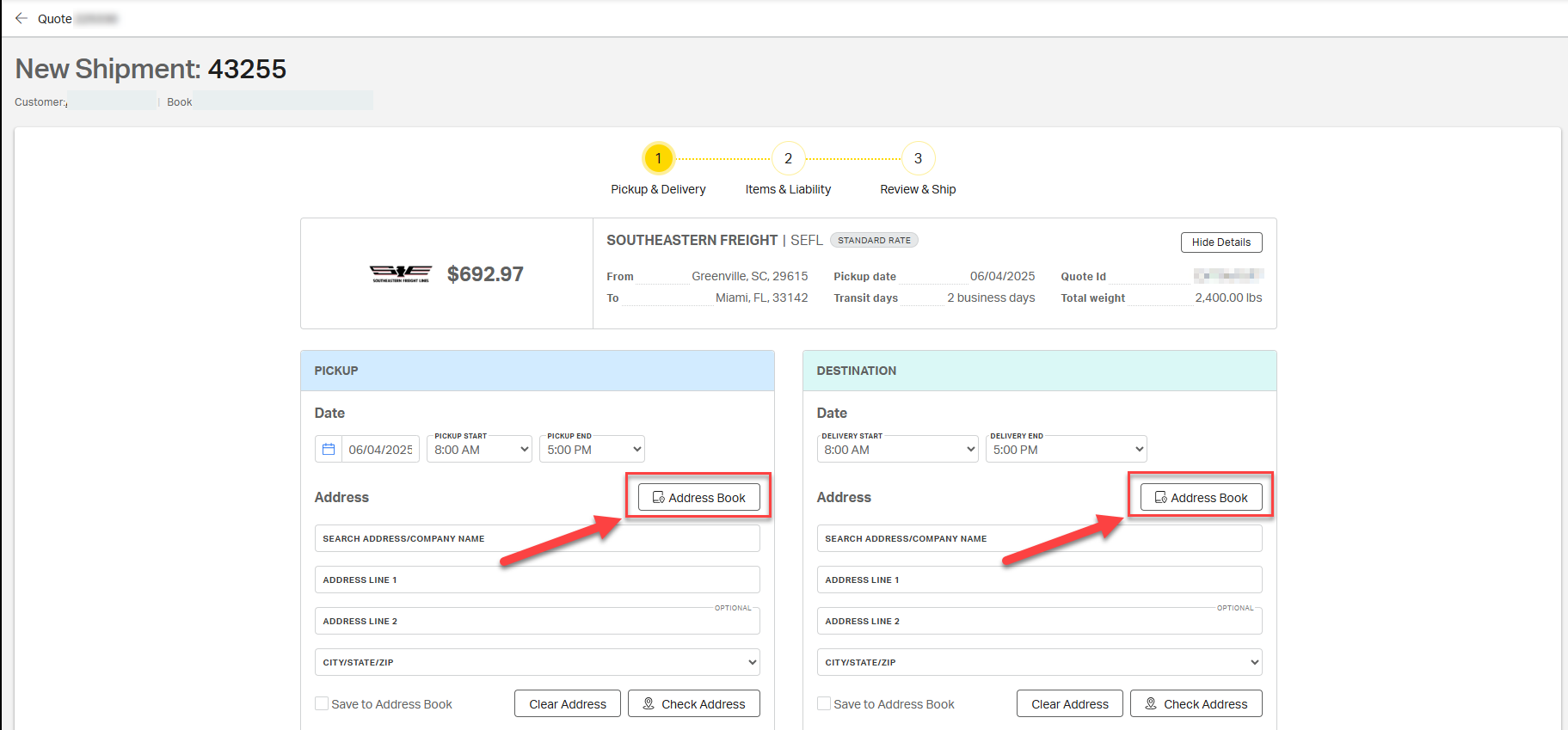 1. Select Address Book in the Pickup and/or Destination forms.