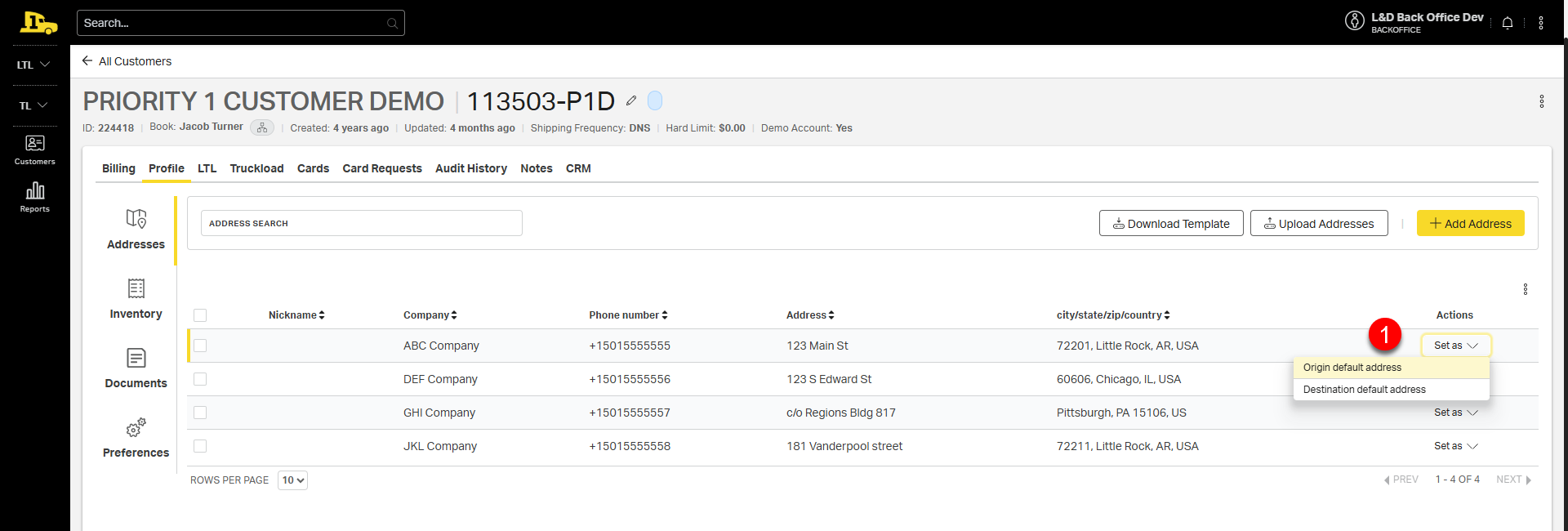 - To set a default, select Set as next to the address, then choose Origin default address or Destination default address.