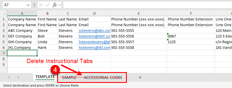 4. Delete the Sample and Accessorial Codes instructional tabs before saving and closing the file.